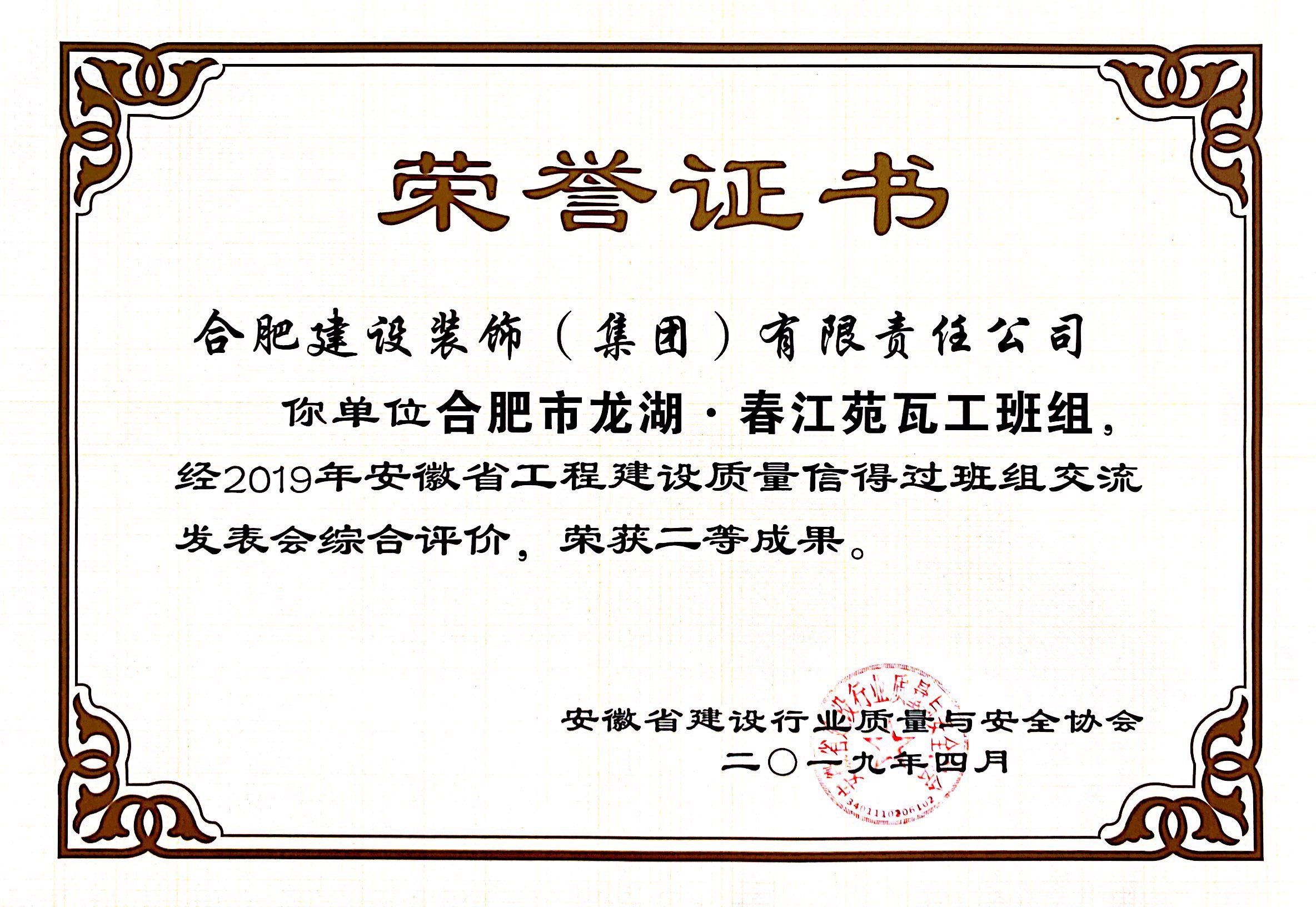 >2019年安徽省工程建设质量信得过班组二等效果