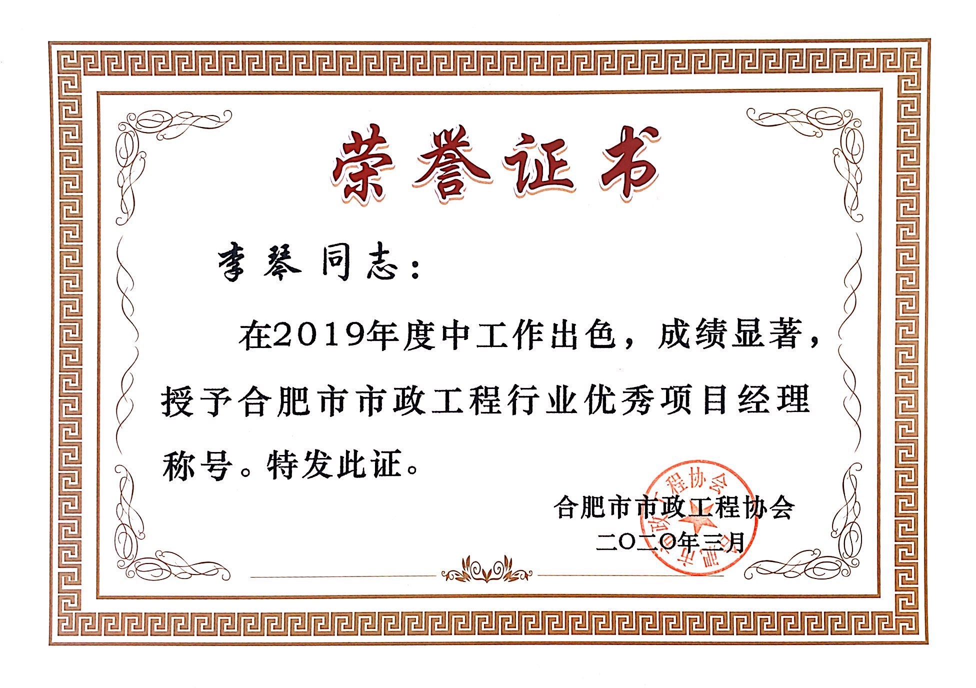 >李琴2019市政优异项目司理