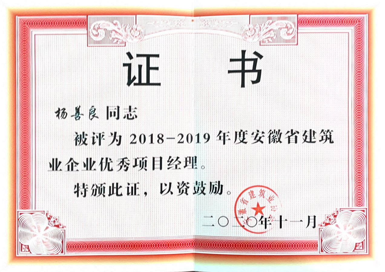 >2020年安徽Jackpot筑业企业优异项目司理--杨善良