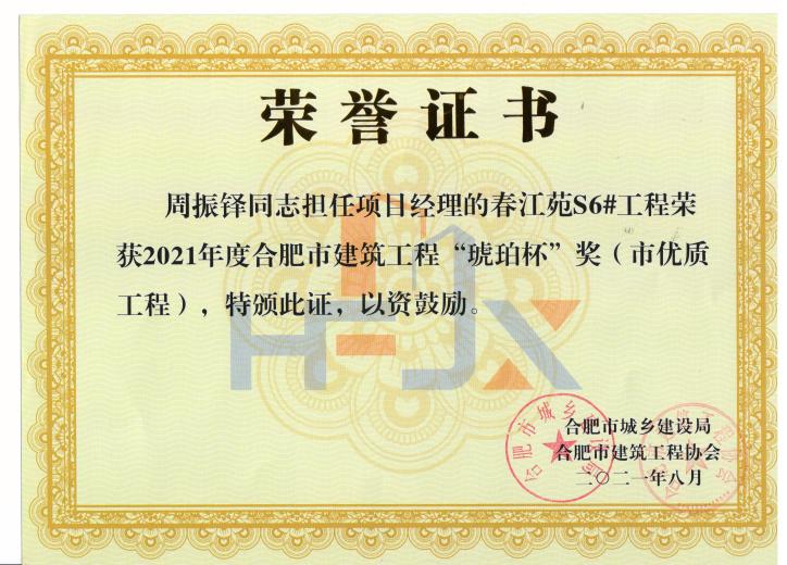>周振铎-春江苑S6#--2021年度合肥市修建工程“琥珀杯”奖(市优质工程)