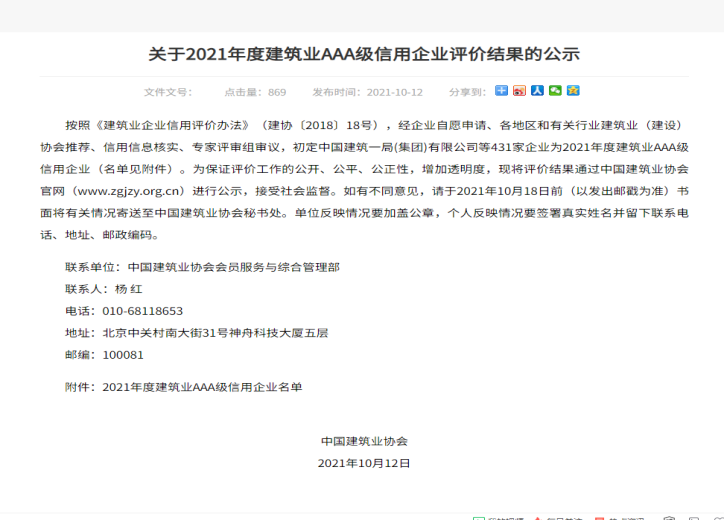 >关于2021年度修建业AAA级信用企业评价效果的公示